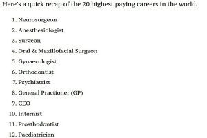 مطابق معمول چند دهه اخیر، در راس پردرآمدترین شغلهای جهان جراحی مغز و اعصاب با درآمدی بسیار بالاتر از سایر مشاغل قرار دارد.